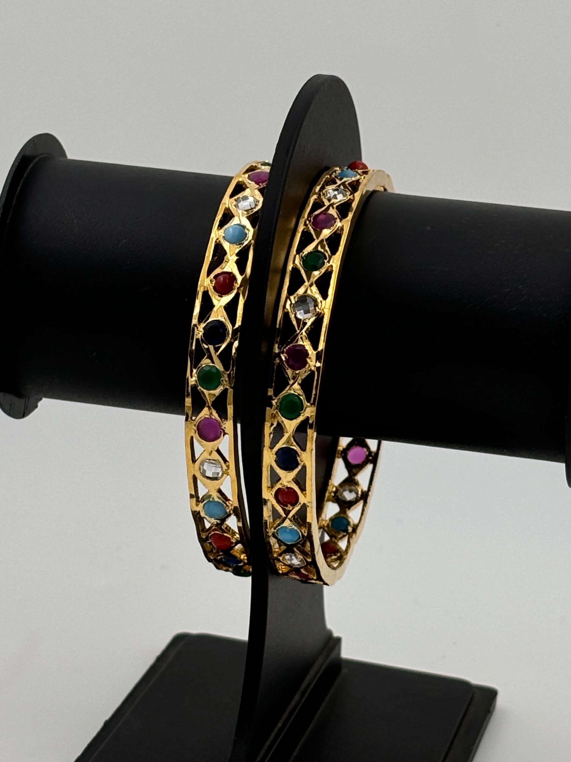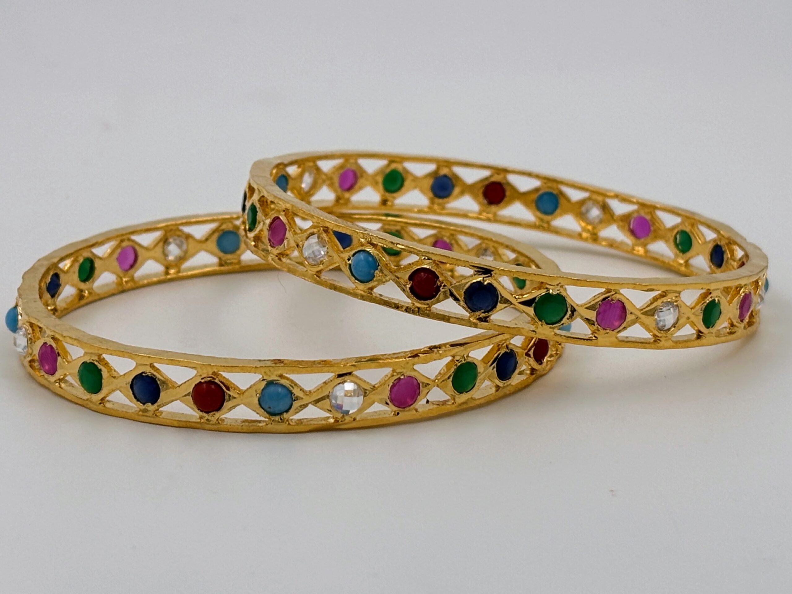 Inspired by the royal elegance of Hyderabad, these gold plated Navratan bangles are a timeless blend of tradition and grace. Adorned with vibrant Navratan stones—each symbolising prosperity, strength, and positivity—these bangles reflect exquisite craftsmanship and classic charm. The intricate lattice design enhances their regal appeal, making them a perfect statement accessory for festive and wedding wear.