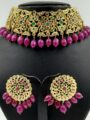 A timeless ode to royal elegance, this Hyderabadi-inspired choker set is crafted to make a statement. Featuring intricate gold-plated detailing adorned with rich ruby-tone beads and subtle green accents, the choker beautifully frames the neckline with a regal charm. The matching earrings mirror the craftsmanship, adding balance and grace to the ensemble.