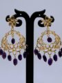 Add a touch of regal charm to your look with these exquisite gold plated statement earrings. Designed with an intricately crafted traditional motif, the earrings are beautifully highlighted with rich purple drop beads that add depth and elegance. The detailed gold framework gives a heritage feel, making them perfect for festive occasions and celebrations.