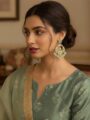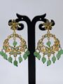Graceful and timeless, these gold plated chandbali earrings are designed to add soft elegance to your ethnic look. Featuring a delicately crafted floral top and an ornate crescent silhouette, the earrings are beautifully finished with soothing mint green drop beads that lend a fresh, refined charm. The intricate detailing and subtle colour palette make them perfect for both daytime festivities and elegant evening wear.
