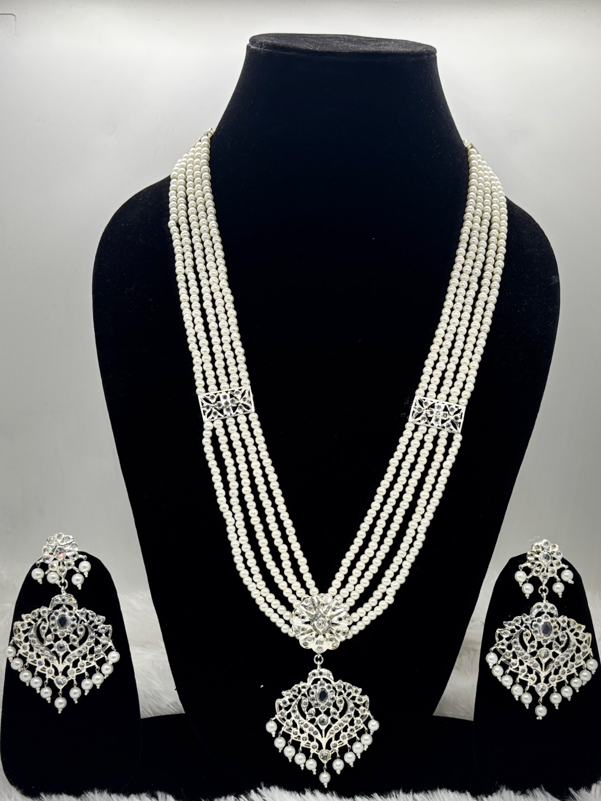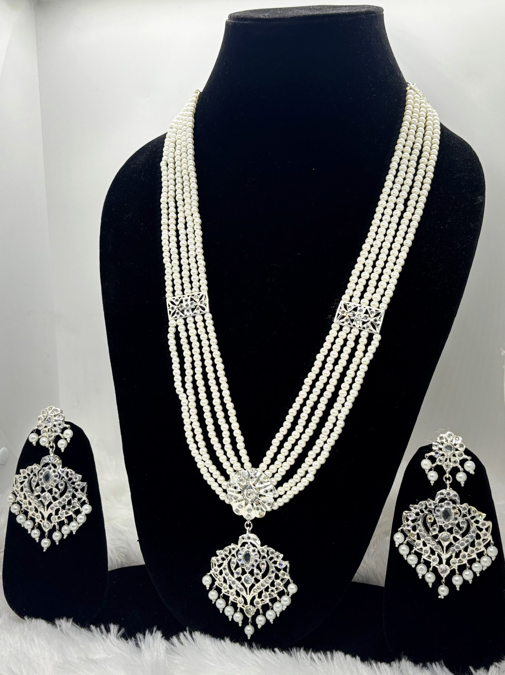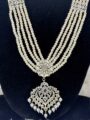 This elegant silver plated long Hyderabadi necklace is a timeless blend of regal charm and delicate craftsmanship. Designed with multiple strands of lustrous pearl beads, it features intricately crafted silver toned motifs adorned with sparkling stones and pearl hangings that add graceful movement and richness.