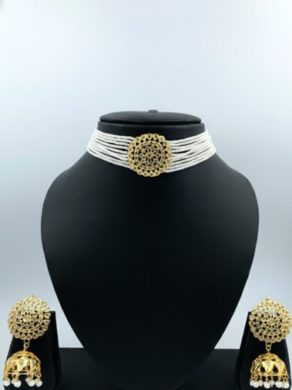 Inspired by the royal elegance of Hyderabadi heritage, this gold plated choker set is a timeless blend of tradition and grace. The choker features multiple strands of pristine pearls, beautifully centered with an intricately crafted circular motif adorned with fine detailing and shimmering stones.