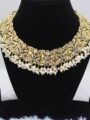 A timeless ode to royal Deccan craftsmanship, this Hyderabadi Jadau necklace set is exquisitely crafted in rich gold plating. The necklace features intricate leaf-inspired motifs adorned with classic jadau work, delicately set with uncut-style stones that reflect old-world charm. A graceful fringe of hand-strung pearls adds movement, elegance, and a regal finish to the design.
